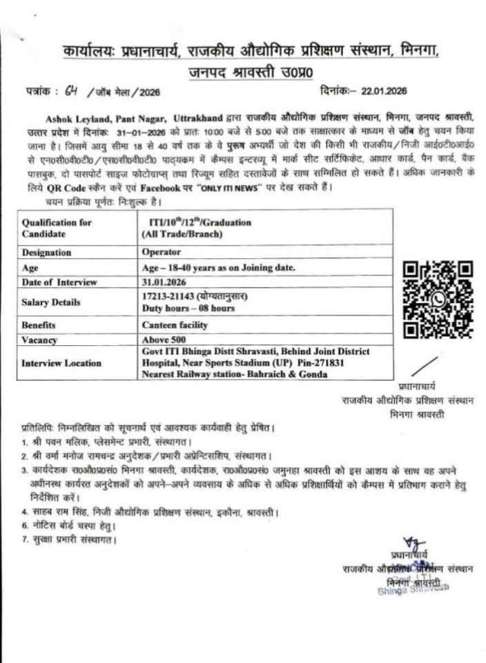 राजकीय औद्योगिक प्रशिक्षण संस्थान (ITI), भिनगा, श्रावस्ती के प्रधानाचार्य द्वारा जारी सूचना के अनुसार, इस भर्ती प्रक्रिया के माध्यम से 500 से अधिक ऑपरेटरों का चयन किया जाएगा।