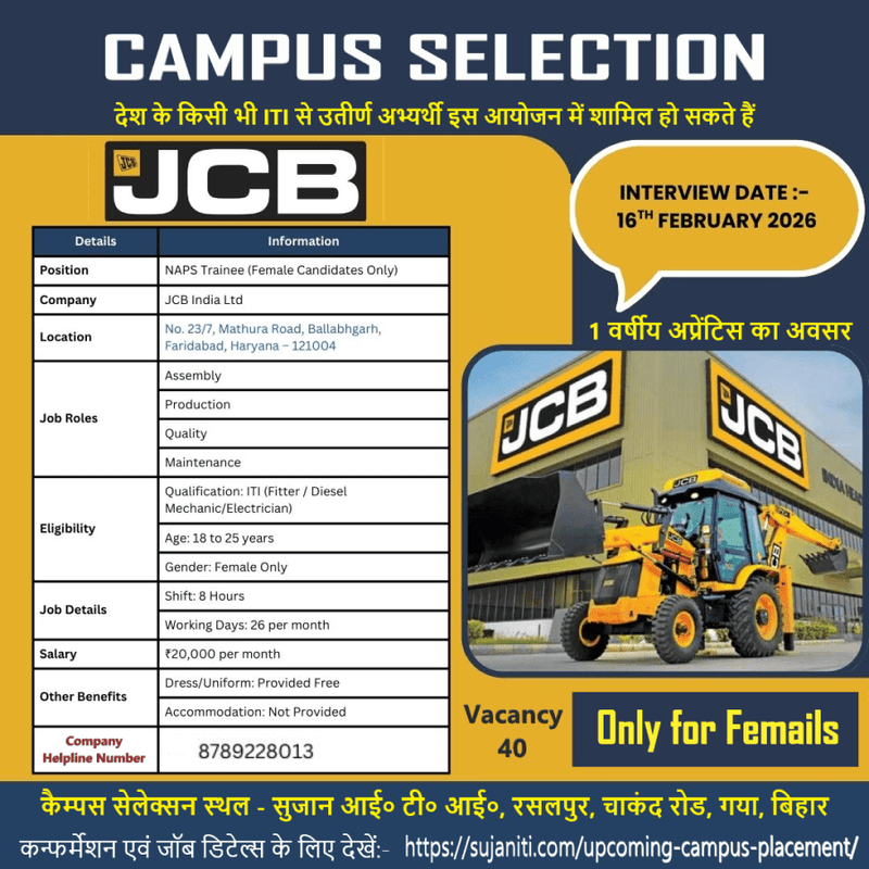 JCB India Ltd Campus Placement 2026 | ITI Pass |